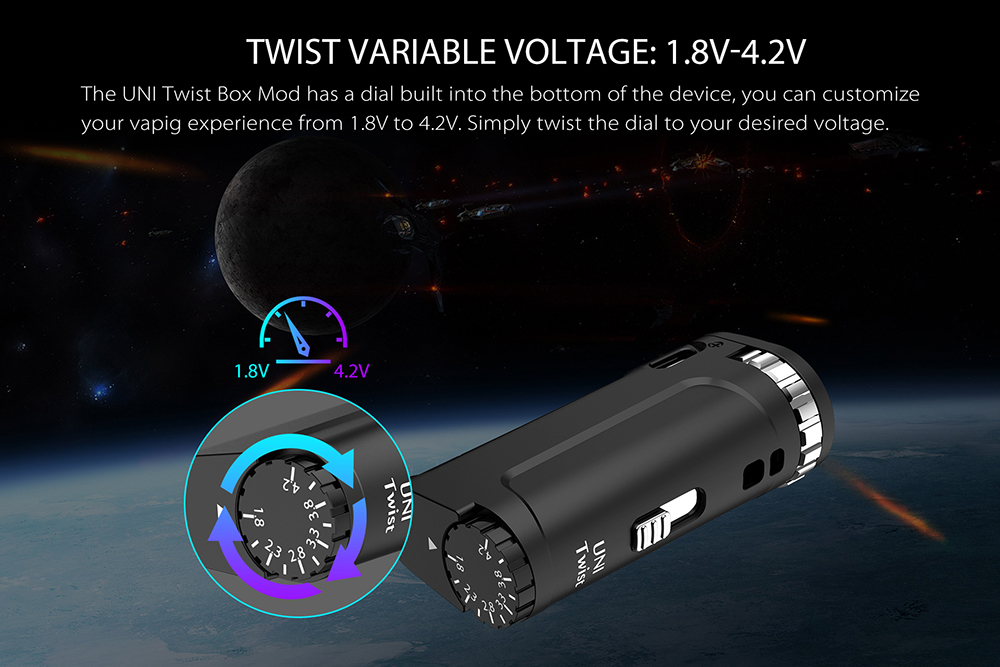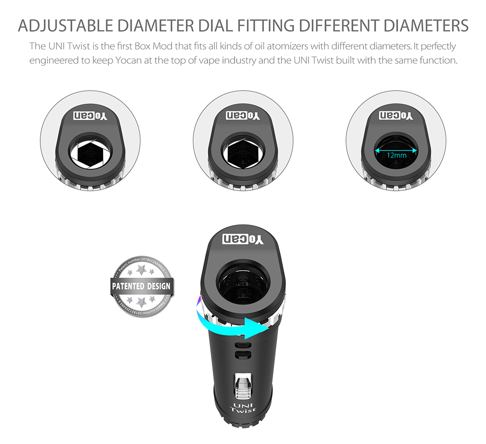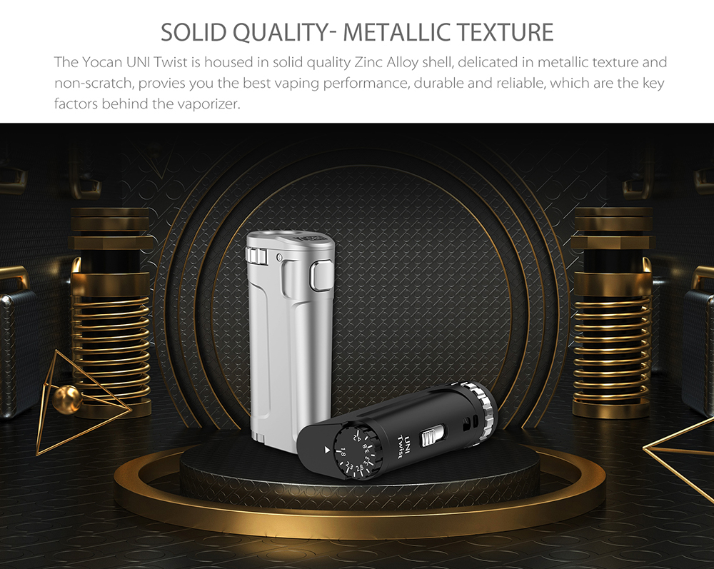 The Yocan UNI Twist Is Housed In Solid Quality Zinc Alloy Shell Which Is Durable And Reliable. It Can Fit All Kinds Of Oil Atomizers With Adjustable Dial And Height Slider.